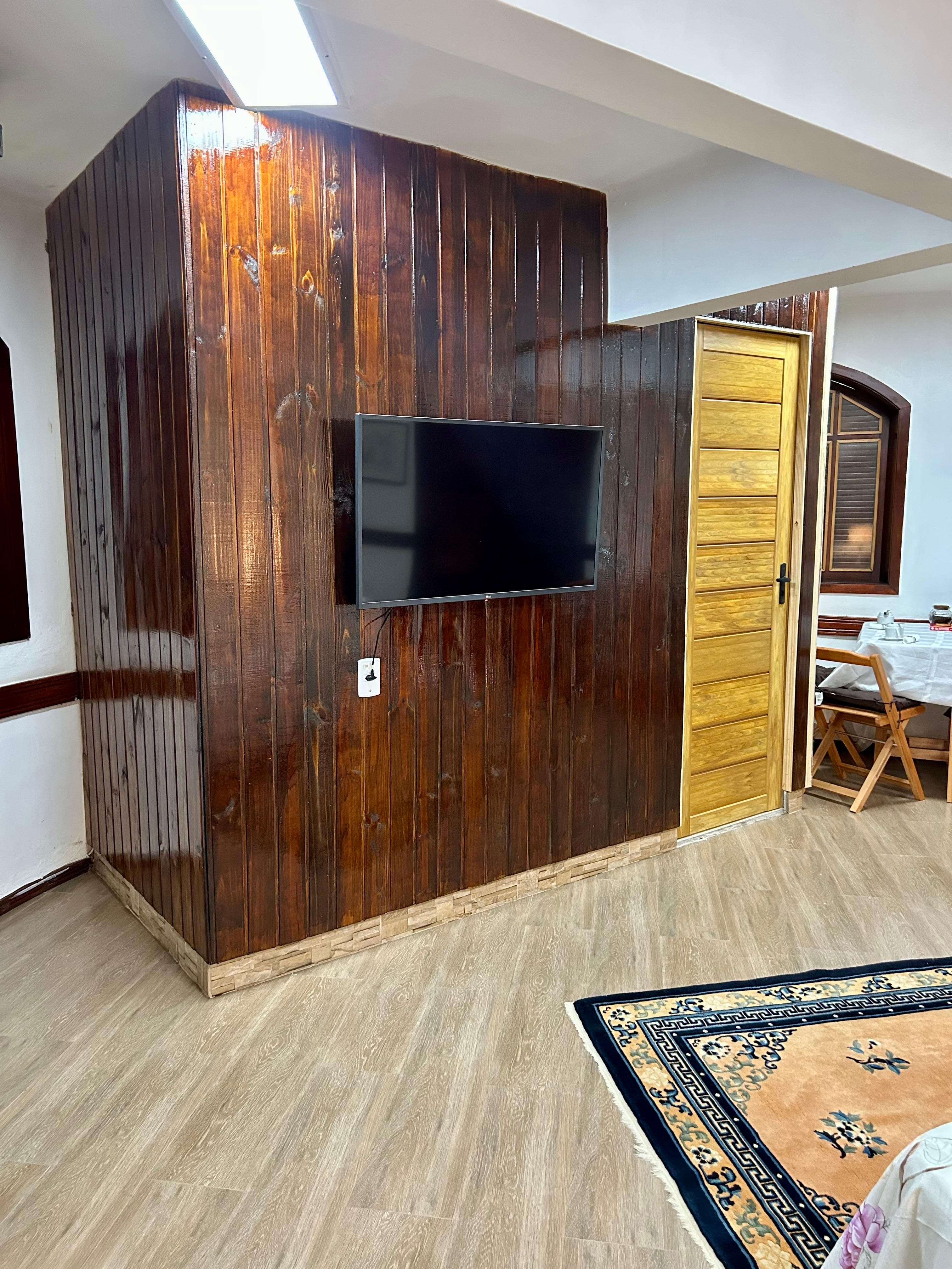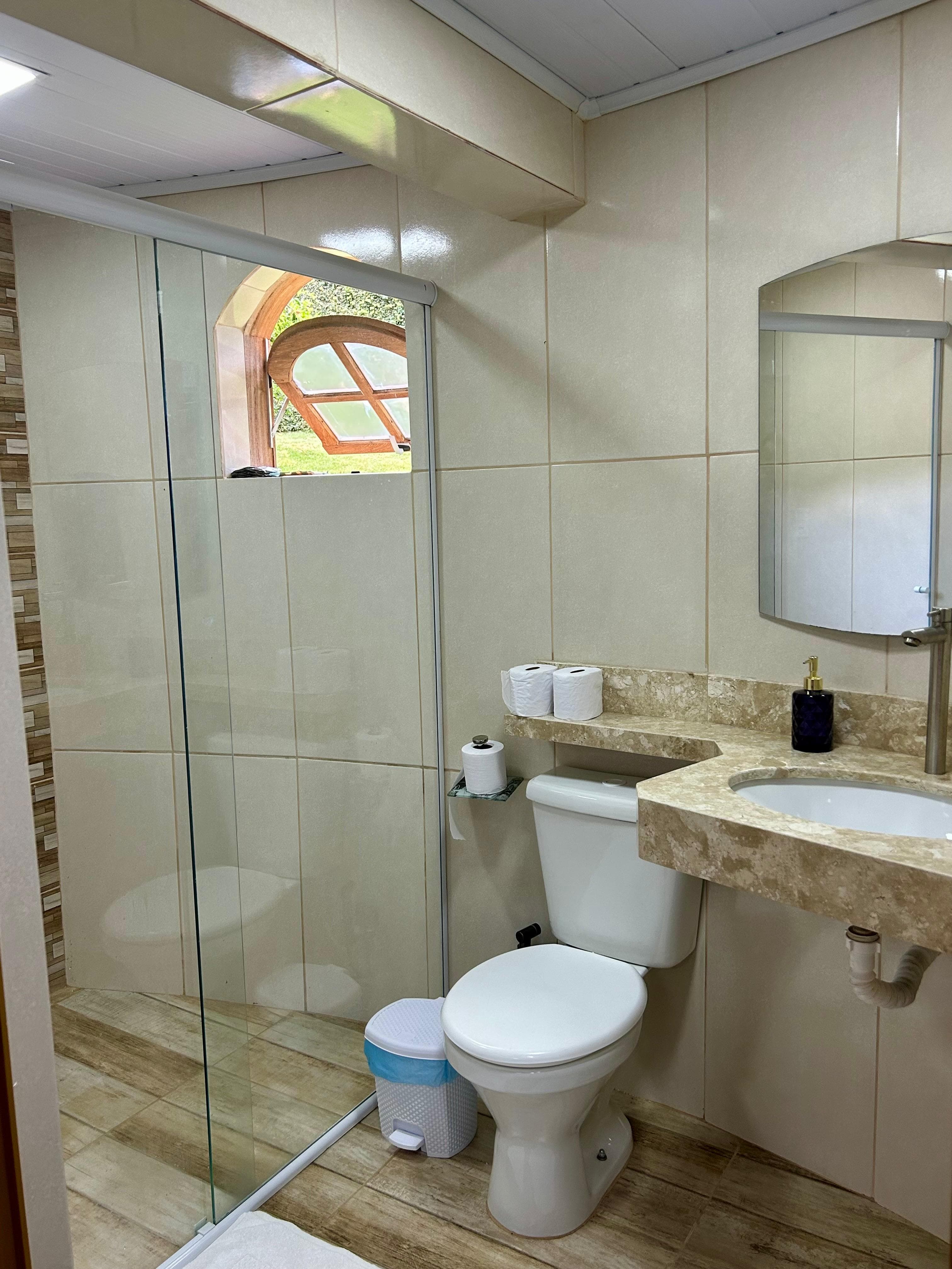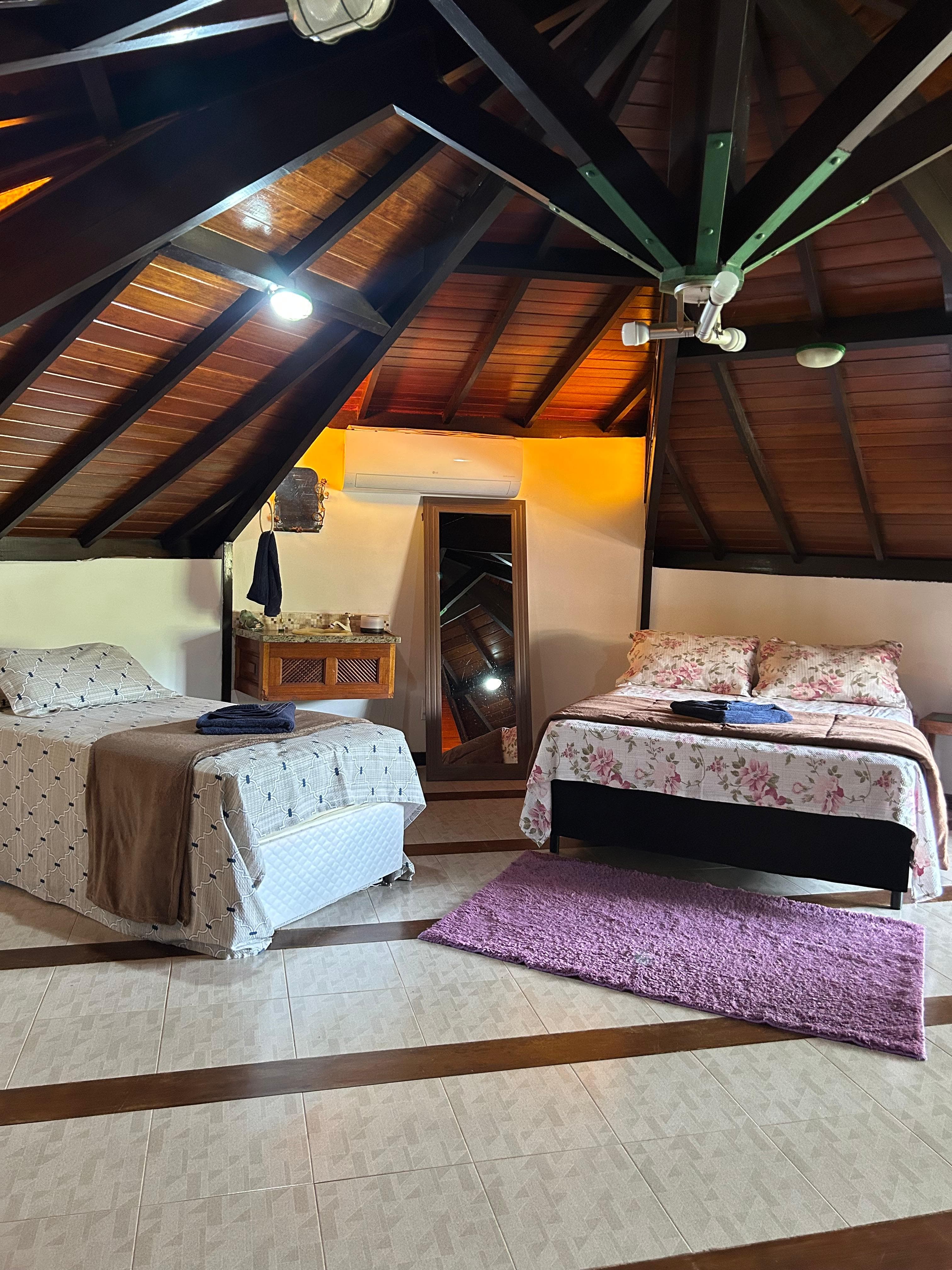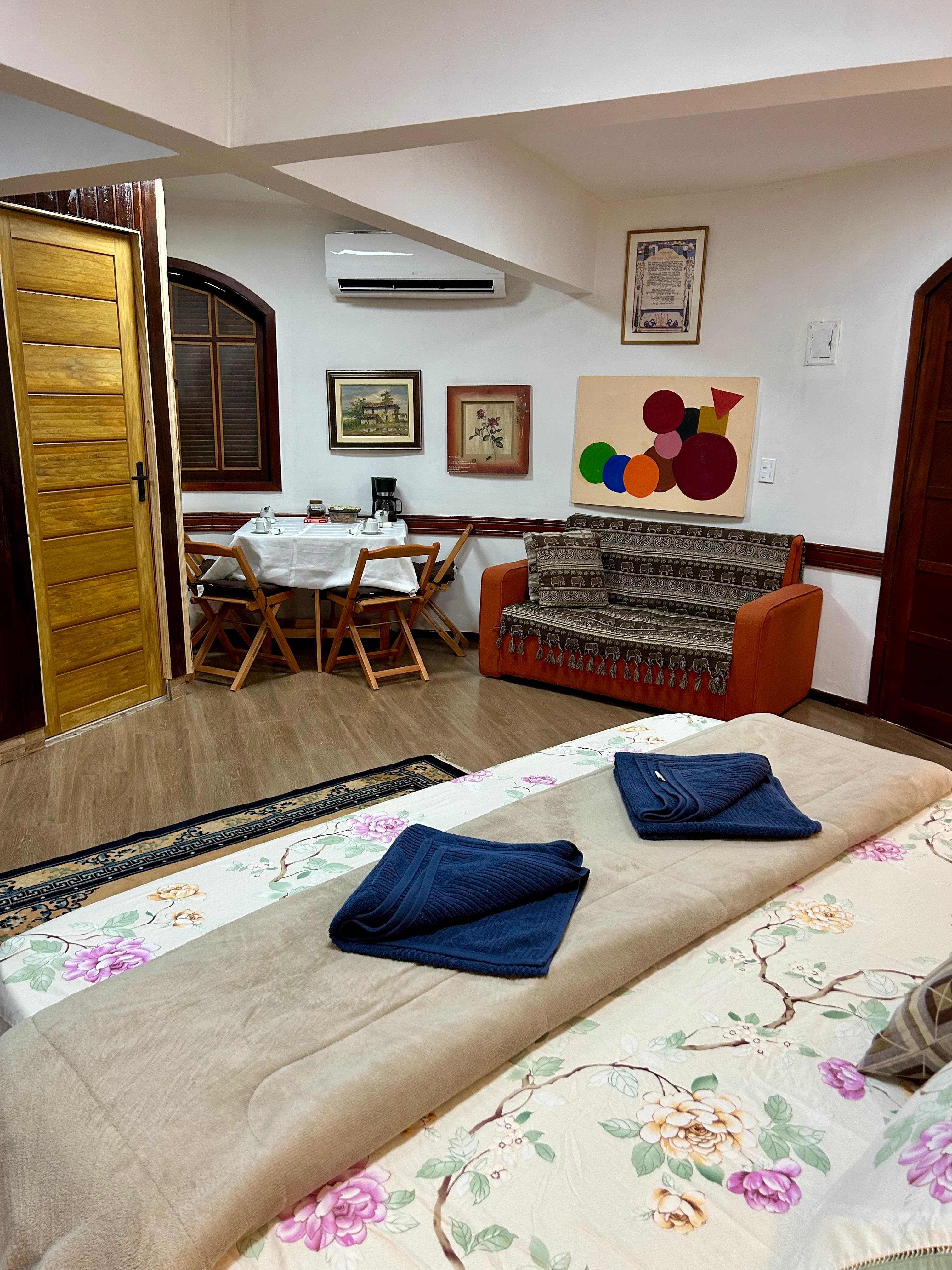 Conhecer a Suíte Esperança 01No térreo, o quarto oferece uma cama super king, sofá-cama, mesa de café, TV Smart de 43 polegadas, banheiro completo...